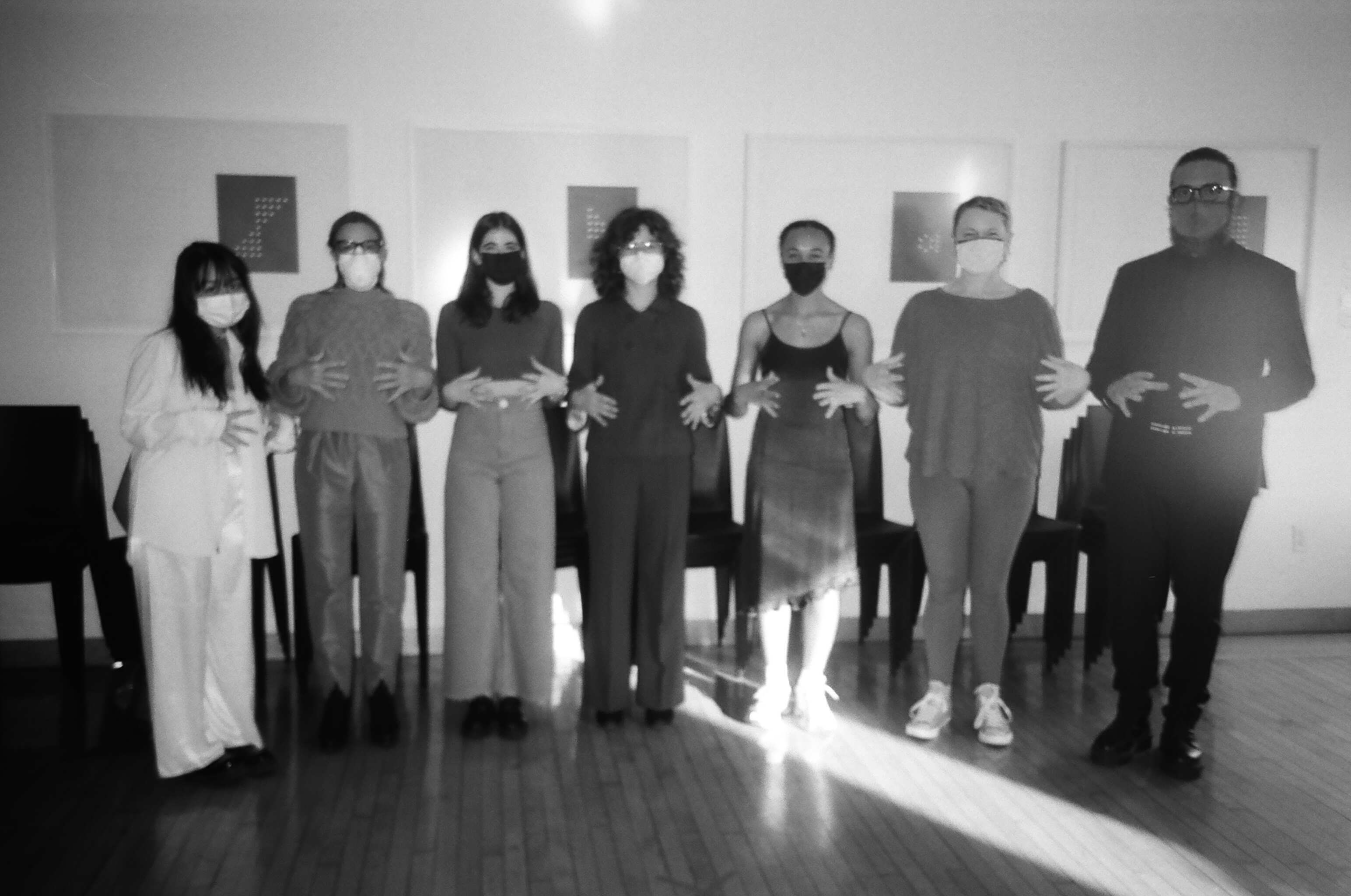 Ari Nguyen, Melissa Grey, Bruna D'Amore Giampietro, Anna Mader, Jasmine Jensen, Hannah Ward, and David Morneau after 'Collective Sounding' at The New School.