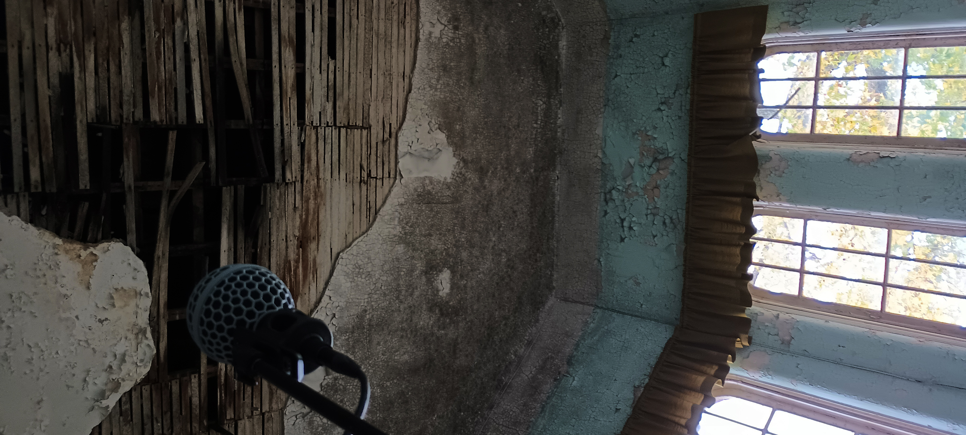 Hole in ceiling above microphone in Building 2, Parlor 311