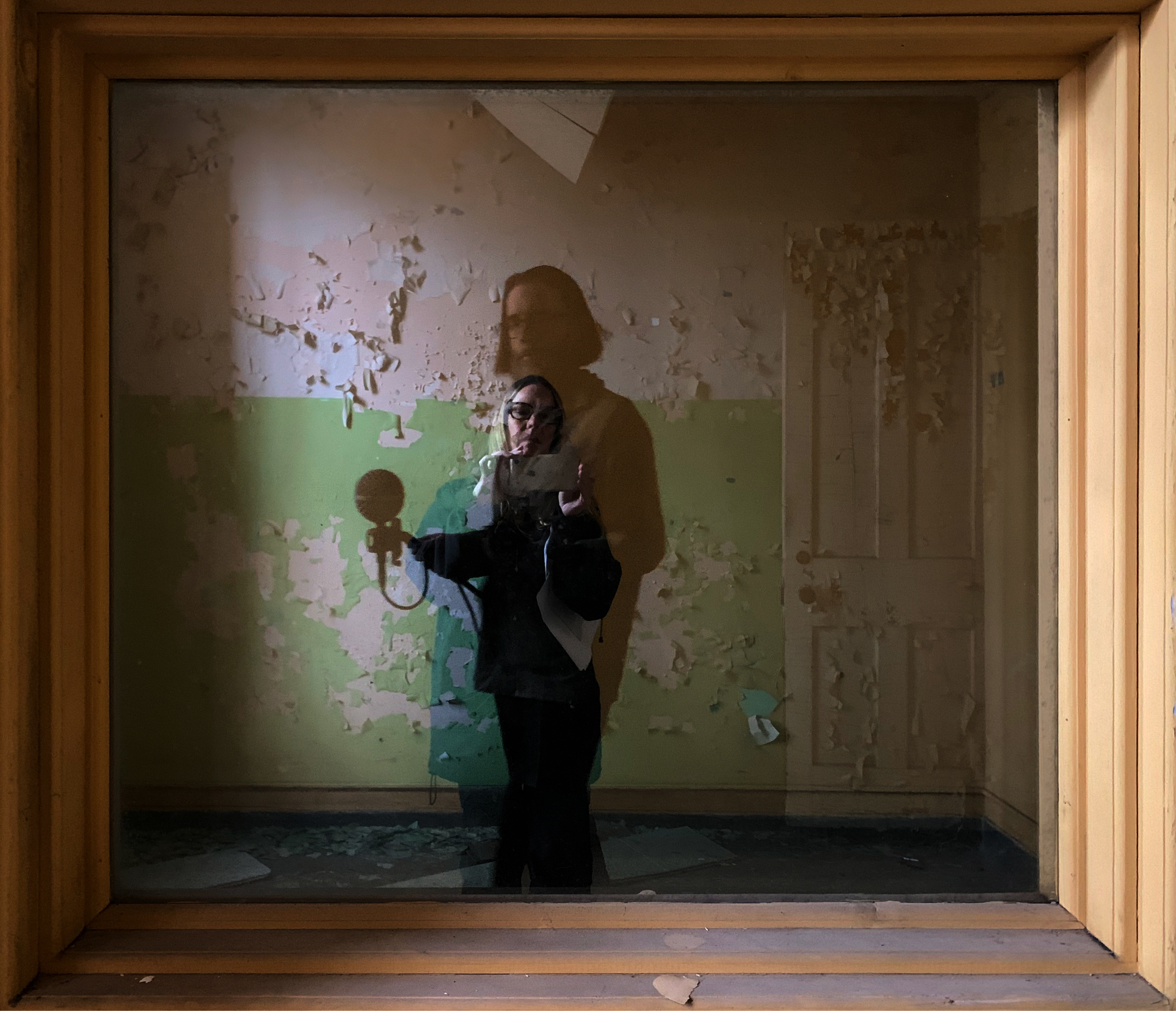 Melissa Grey reflected in one-way mirror with view of David Morneau in observation room
